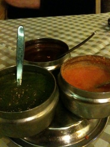 The dips: Orange was from carrot and had very good flavor but bad texture. Green was my favorite from coriander and garlic and had a spiciness ending of the bite. The red was weird and not appealing at all, with a taste of red wine and we guessed maybe grapes or prunes? Two out of three ain’t bad.