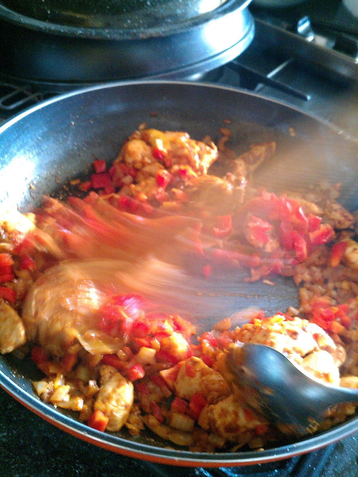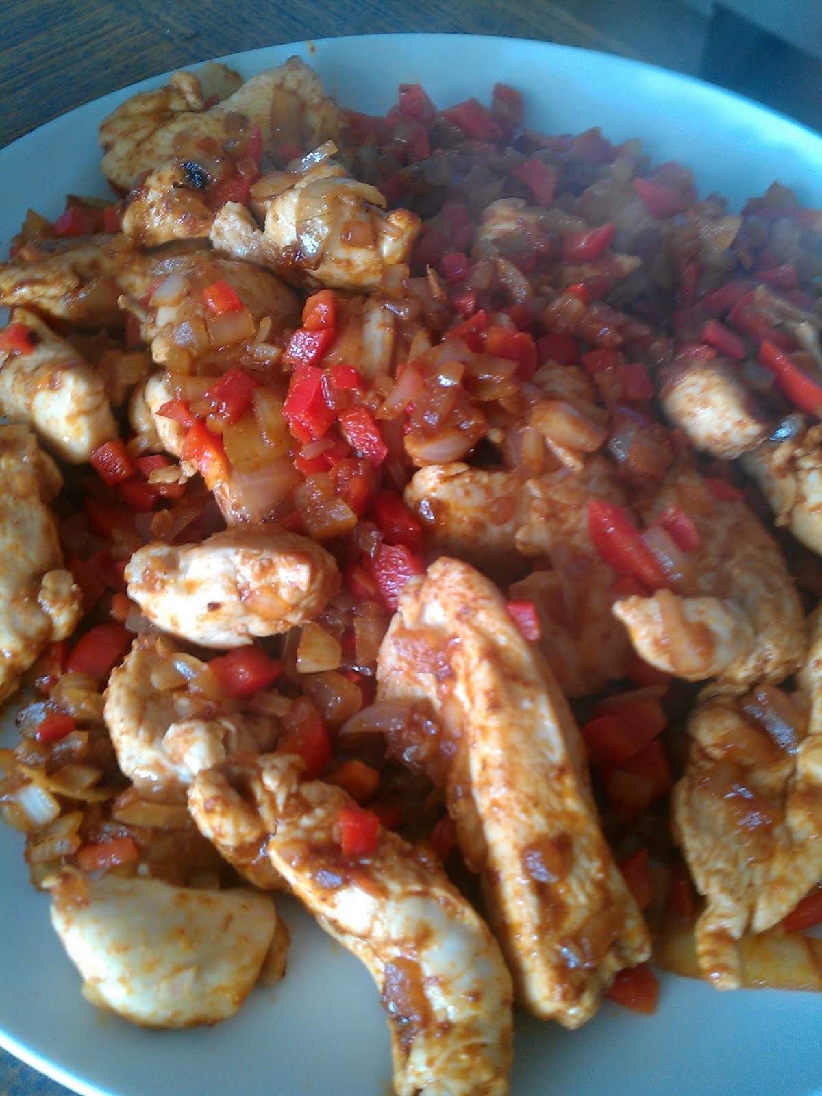 Add slices of chicken breast, not to small so that they will not dry out. Then a finely chopped red bell pepper.