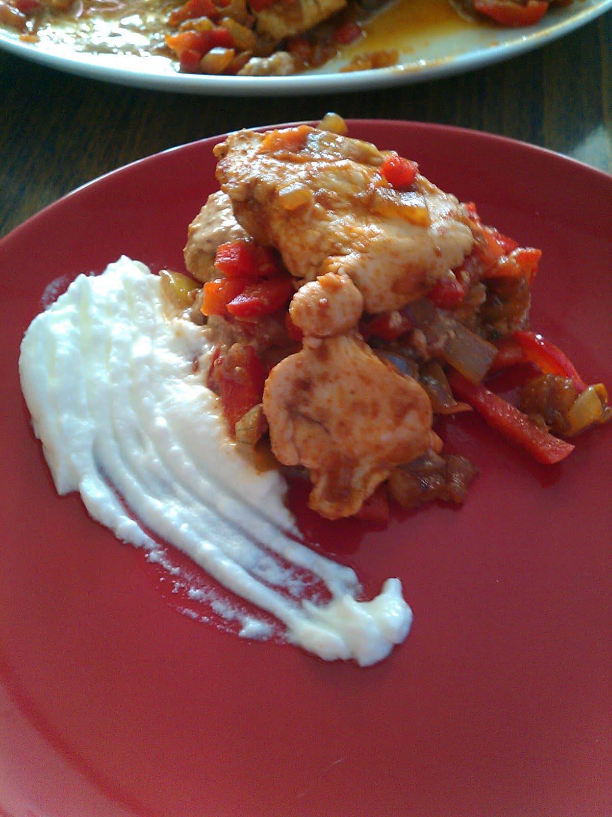 Then serve with the paprika yogurt on top and with additional portion of fresh yogurt on the side or under the chicken.