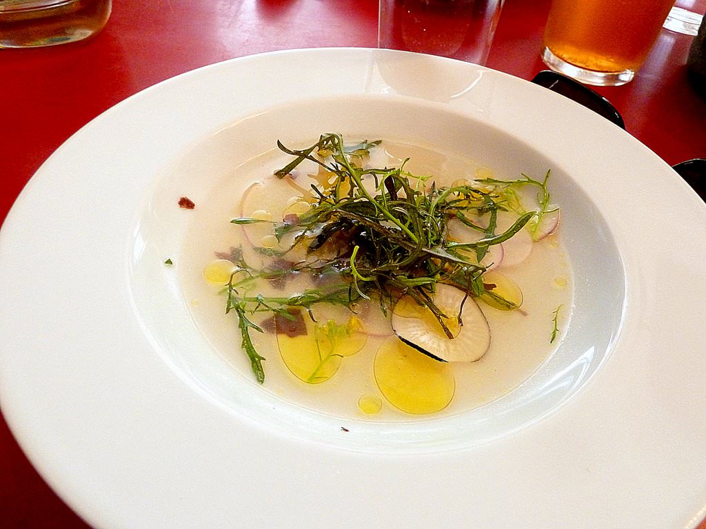 That was definitely a weird dish. I did not get it. A piece of fish was missing or something to make it feel more than just flavored water with radish. Too bad.