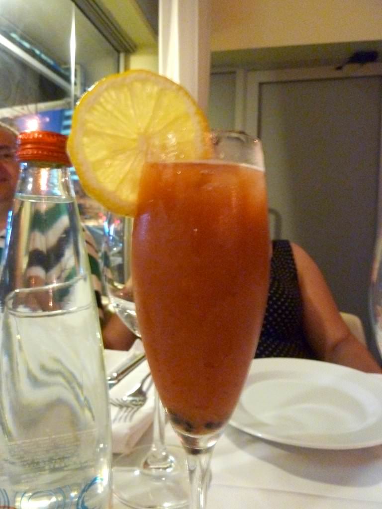 We started off with a sweet cocktail. It was vodka and fruit juice and passion fruit. I made it better by diluting with water and squeezing in this lemon wedge.
