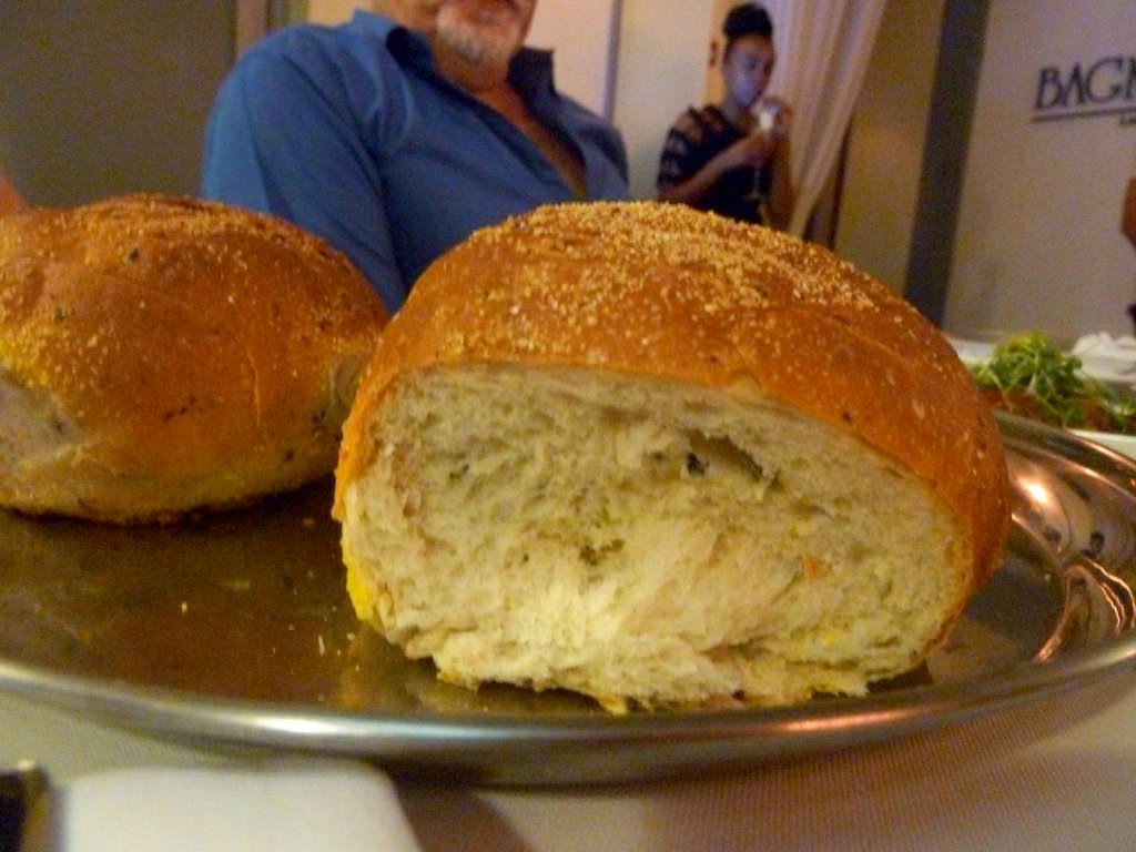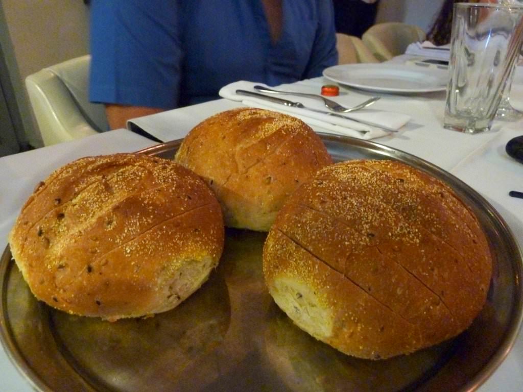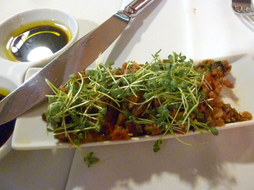 Grilled tomato eggplant salad for the bread, and olive oil with balsamic vinegar at the left. There was also Tehini spread (someone just could’t resist the urge). So far very Israeli start to a meal. This salad was rather good though.