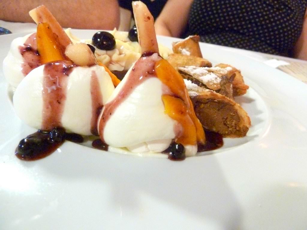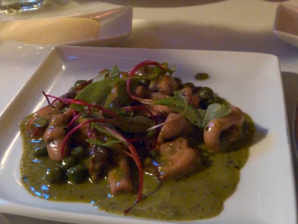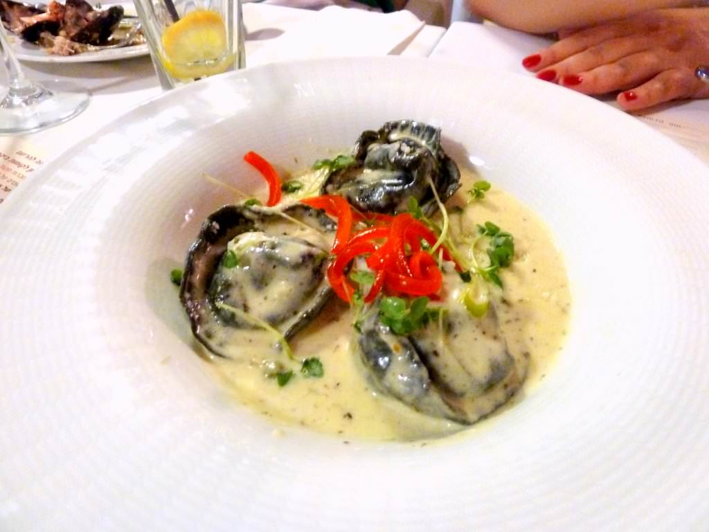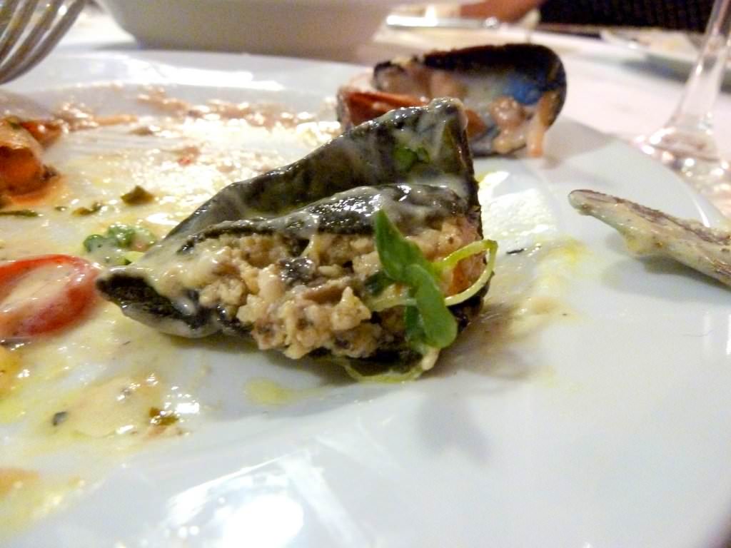 Black tortellini stuffed with brie and grouper in olive oil and vegetables brunoise. This was the description of this dish but what we got was: Black tortellini stuffed with some kind of fish and mushrooms swimming in another creamy and heavy sauce. I’m still looking for the vegetables brunoise.