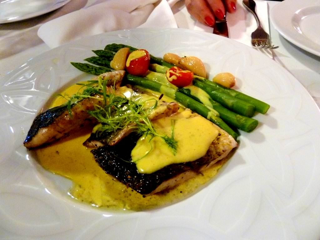 Fillet of Sea Corvina, saffron cream, asparagus.
